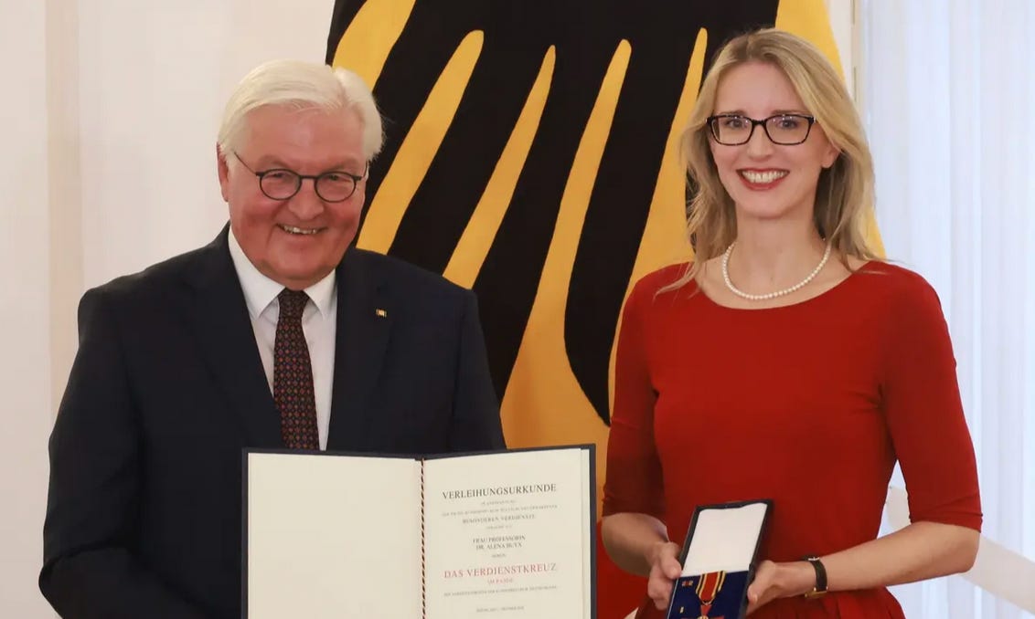 Die Nomenklatura verleiht sich derweil selbst eine neue Kategorie Preise, nämlich das „Bundesverdienstkreuz am laufenden Bande“. Kein Irrtum ohne öffentliche Weihen! Alena Buyx wird dekoriert für die von ihr gelieferte Umkehrung jeglicher Ethik, ein umgeimpfter Bundeswehrsoldat beendete parallel dazu gerade seinen Hungerstreik. Er sitzt für die Verweigerung der Impfung im Gefängnis. Nach allem, was wir schon immer wissen konnten, lag er richtig und wird bestraft. Erstere irrte und wird immer noch geehrt. Geht eigentlich noch mehr an dämonischer Umkehr?