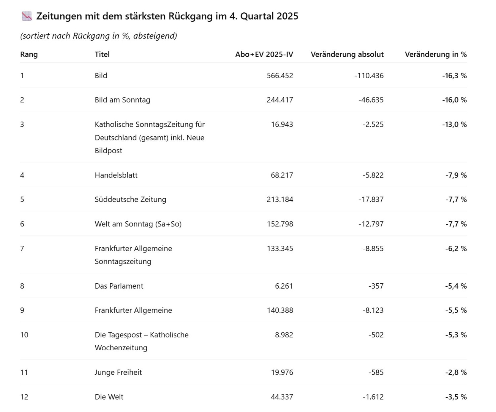 Gerade schaue ich auf die neuesten Zahlen der Mainstream-Presse: zweistellige Einbrüche im letzten Quartal 2025 – über 16% bei der Bild-Zeitung, über sieben Prozent bei der Süddeutschen Zeitung. Erdrutsche, die massive Auswirkungen auf Anzeigen und Finanzierung haben werden. Der Medienwandel ist in vollem Gange und ich bin Teil davon.