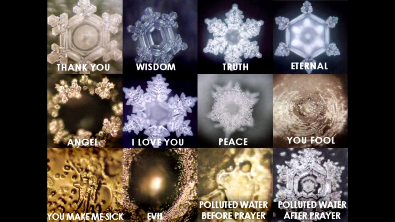 Negativ beeinflusstes Wasser (Hass, Aggression, negative Gedanken, Heavy-Metal-Musik) hingegen chaotische, unregelmäßige Formen.