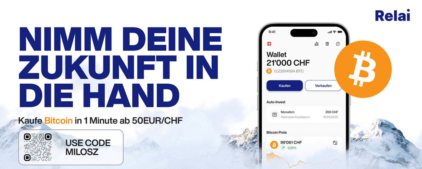 Oft höre ich: Bitcoin ist so volatil – wann steigt man am Besten ein? Das beste Trading ist das Non-Trading. Bei RELAI können Sie individuelle Sparpläne einrichten, wöchentlich oder monatlich: So kaufen Sie immer zum besten Durschnittspreis und können langfristig mit der besten Spartechnik selbstverwaltetes Vermögen aufbauen. RELAI steht Ihnen ab jetzt im gesamten EU-Raum zur Verfügung, mit dem Code MILOSZ sparen Sie Gebühren (keine Finanzberatung). Haftungsausschluss: Relai ist gemäss dem MiCA-Regulierungsrahmen berechtigt, Krypto-Asset-Dienstleistungen in der Schweiz und in der gesamten Europäischen Union anzubieten. Nach Abschluss der Passporting-Verfahren baut das Unternehmen seine Dienstleistungen aktiv auf weitere EU-Mitgliedstaaten aus.