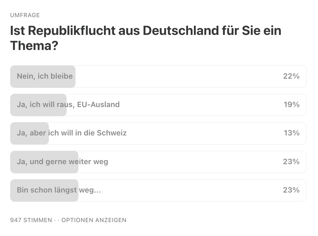 Ich habe vor zwei Monaten erstmals hier im Blog zum Thema Republikflucht eine Umfrage gestartet – und habe nicht schlecht gestaunt. Ich ahnte bereits, dass ich ein kritisches Publikum habe, welches die Lage in Deutschland vermutlich ähnlich katastrophal findet, wie ich. Doch, dass es so viele sind, die weg wollen, hätte ich nicht gedacht. Von fast 1000 Teilnehmern an der Umfrage wollte gerade mal eine Minderheit von 22% bleiben! Der Rest will weg, ins EU-Ausland, die Schweiz, in die ganze Welt oder ist es schon längst.