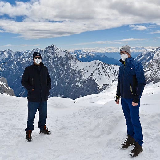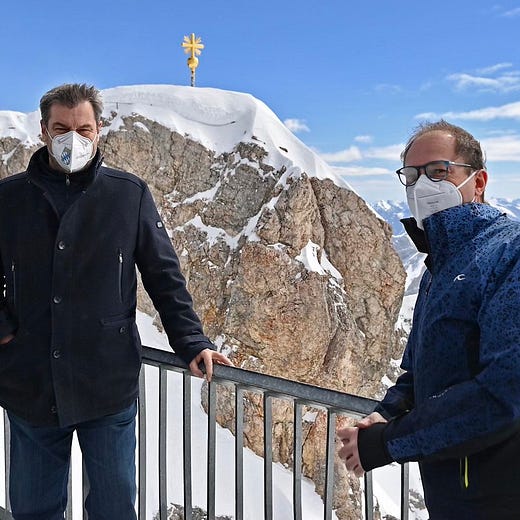 Vor kurzem postete Markus Söder ein Selfie von sich und Alexander Dobrindt auf der Zugspitze. Brav mit FFP-2 Maske und dem üblichen Bavaro-Merchandising. Die Höhenluft muss offenbar direkt auf den Tugendsignalisierungsinstinkt gewirkt haben. Fotos aus dem Nationalpark Berchtesgaden zeigten Markus Söder noch ohne Maske. Was ist also auf dem Weg passiert? Man will sich vorstellen, wie sie da hochgeschnauft sind, Söder mit seinem etwas boshaft-wirren Augenbrauenfixierungsblick, schnauff-schnauff, den Alexander Dobrindt im Schlepptau, beide ohne Maske natürlich, denn – «Hallo, wir sind am Arsch der Welt!» – und man muss ja die Grenzen des gesunden Menschenverstandes nicht völlig überspannen, nicht wahr?
