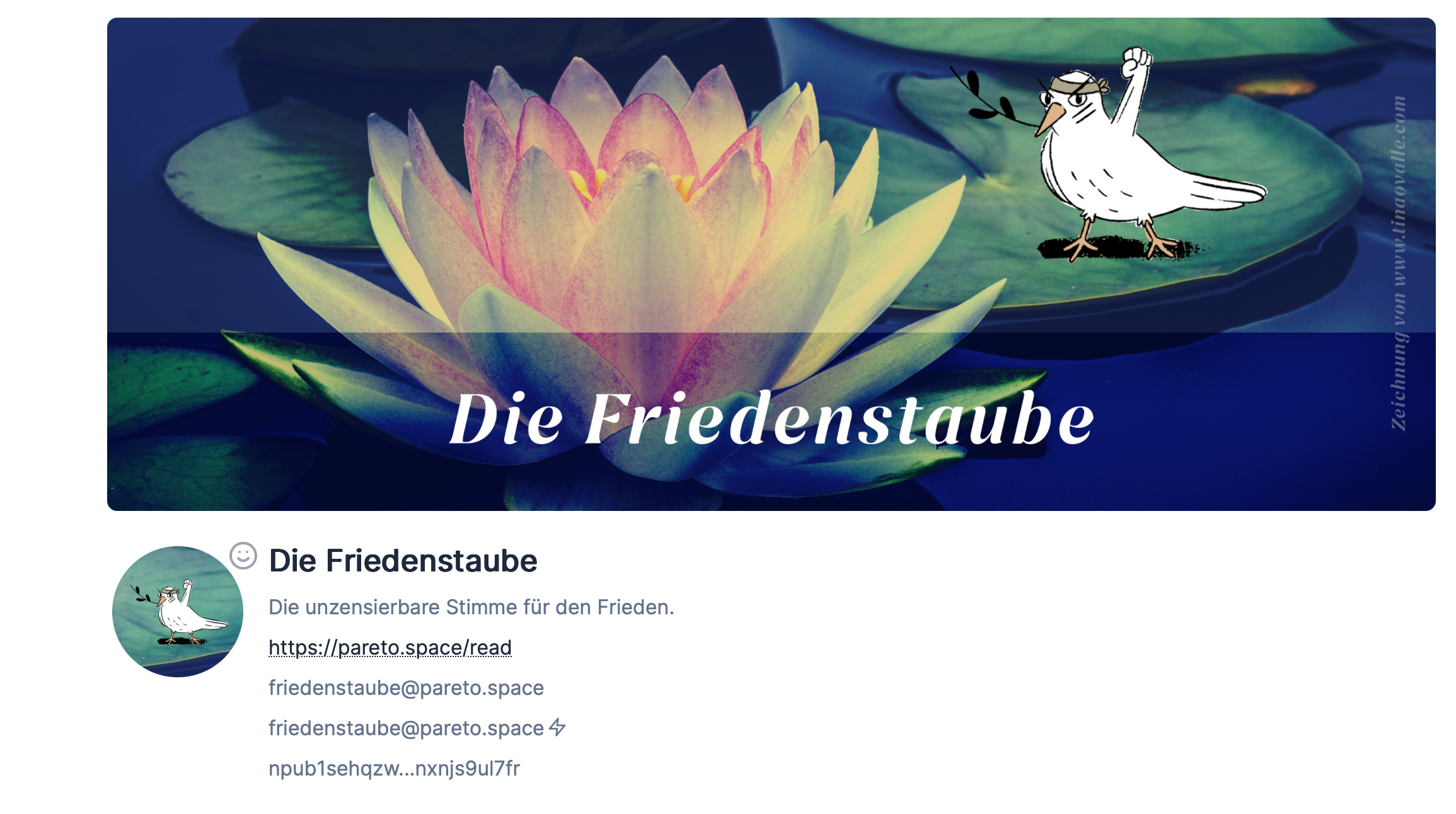 Machen wir den Kriegstreibern einen Strich durch die Rechnung! Bringen wir die Stimmen für den Frieden an einen Tisch! Wir lassen die Friedenstaube fliegen, die erste unzensierbare Friedenspublikation der Welt auf Nostr und Pareto.