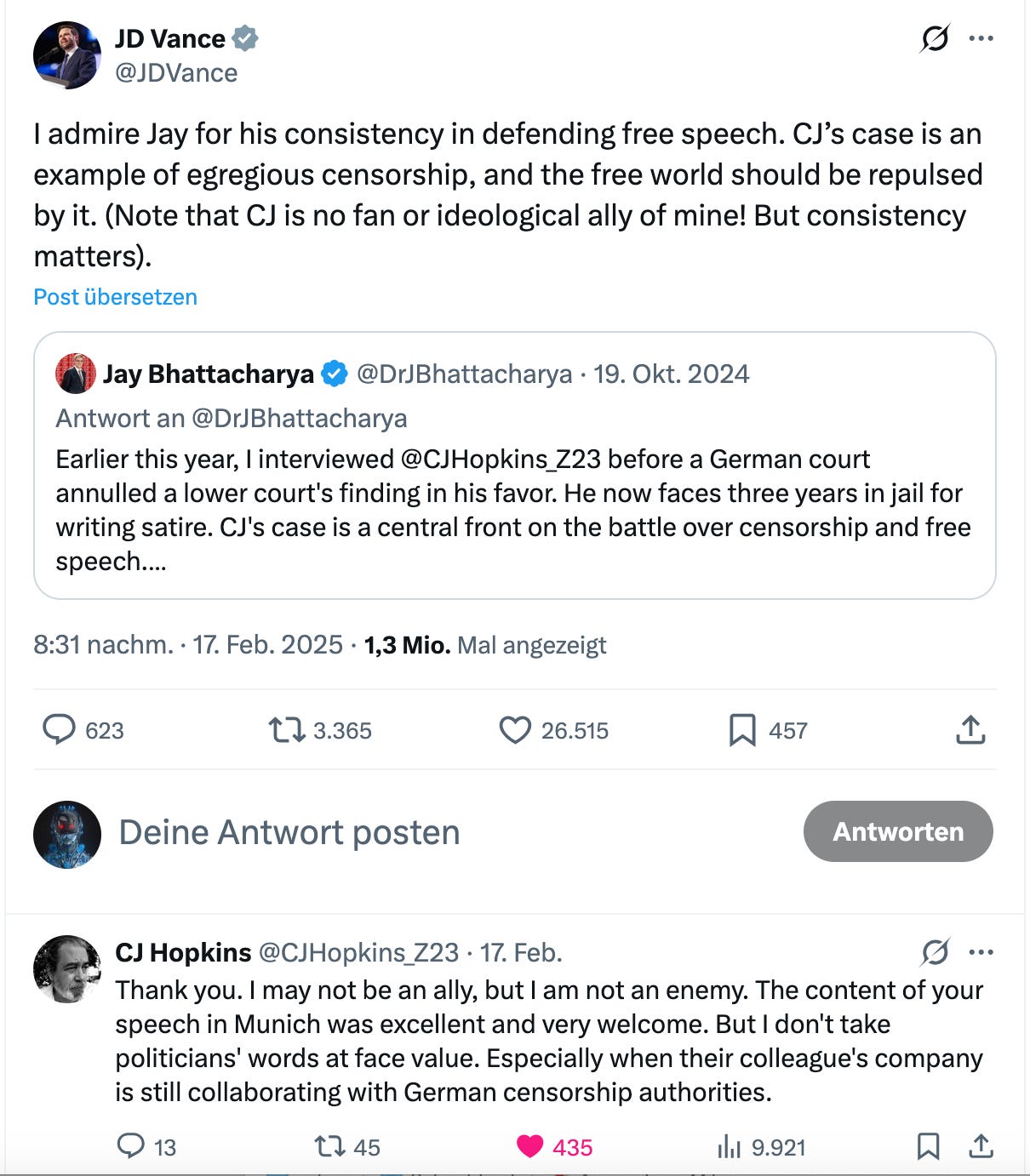 Mögen viele, die jetzt diesen Text lesen, vielleicht am Fall C. J. Hopkins etwas über ihr Land lernen und sich dann aber nicht verstecken, sondern das Feuer der Freiheitssehnsucht in sich aufglimmen spüren.